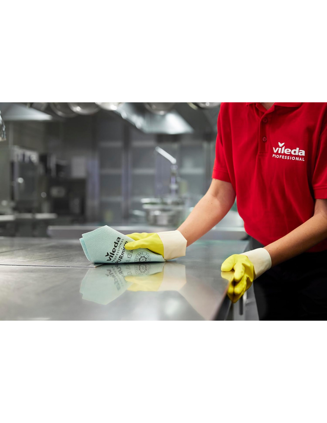 La bayeta Vileda PURmicro en color verde redefine la limpieza con su innovador diseño, fusionando la eficacia de las microfibras tejidas con una capa externa de poliuretano (PUR) para un enjuague más sencillo y un rendimiento de limpieza superior. A diferencia de las microfibras convencionales, la capa de poliuretano estratégicamente ubicada potencia la eliminación de suciedad durante el aclarado, reduciendo hasta 40 veces la retención de partículas, minimizando el riesgo de rayones en las superficies. Combina la potencia de limpieza de la microfibra con la acción arrastrante del PUR para obtener una superficie seca en una sola pasada. PURmicro destaca especialmente en la limpieza de vidrio y acero inoxidable, proporcionando resultados impecables. Perfecta para tareas diarias en oficinas, hoteles y espacios sensibles desde salas de hospitales hasta comedores escolares, donde la higiene es esencial.