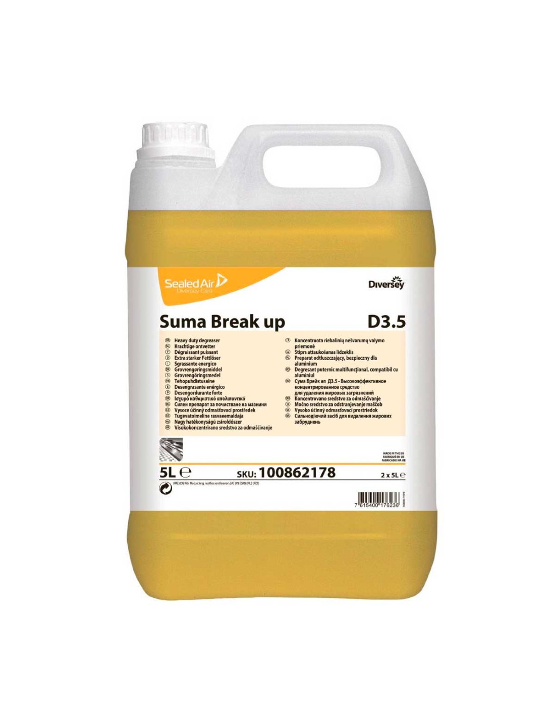Suma Break-up D3.5 formato de una garrafa es un desengrasante líquido concentrado con el que podrás limpiar superficies de la cocina con mucha grasa. No agrede al aluminio. Su mezcla de tensioactivos no iónicos y aniónicos lo hacen adecuado para eliminar con facilidad cualquier resto de comida reseca.