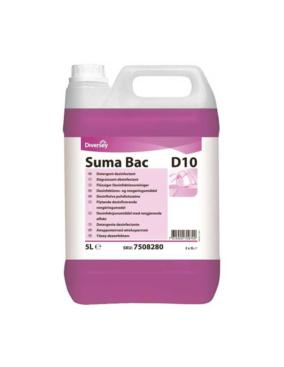 Suma Bac D10 5 litros es un detergente desinfectante con los que podremos limpiar y desinfectar en una sola pasada cualquier tipo de superficie que esté contacto con los alimentos. Elimina la grasa y manchas resecas de comida, efectivo frente a un amplio rango de microorganismos y válido para todo tipo de aguas. Este producto está incluido en el listado del Ministerio de Sanidad de productos biocidas.