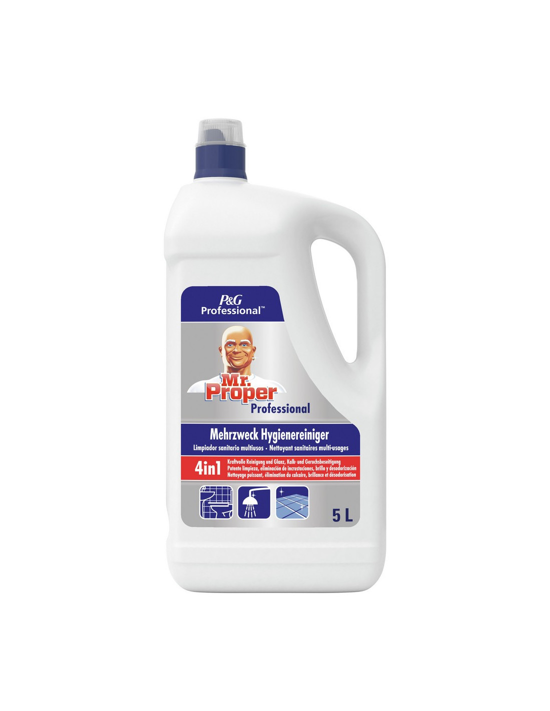 Limpiador desinfectante de baños Mr Proper 3D de 5 litros. Limpia y desinfecta en un solo producto las superficies del cuarto de baño. Se puede utilizar diariamente para eliminar los depósitos de cal. Su desinfección es acorde con la normativa europea. Con el limpiador desinfectante 3D de Mr Proper podrás limpiar suelos, duchas, lavabos, bañeras, inodoros urinarios.