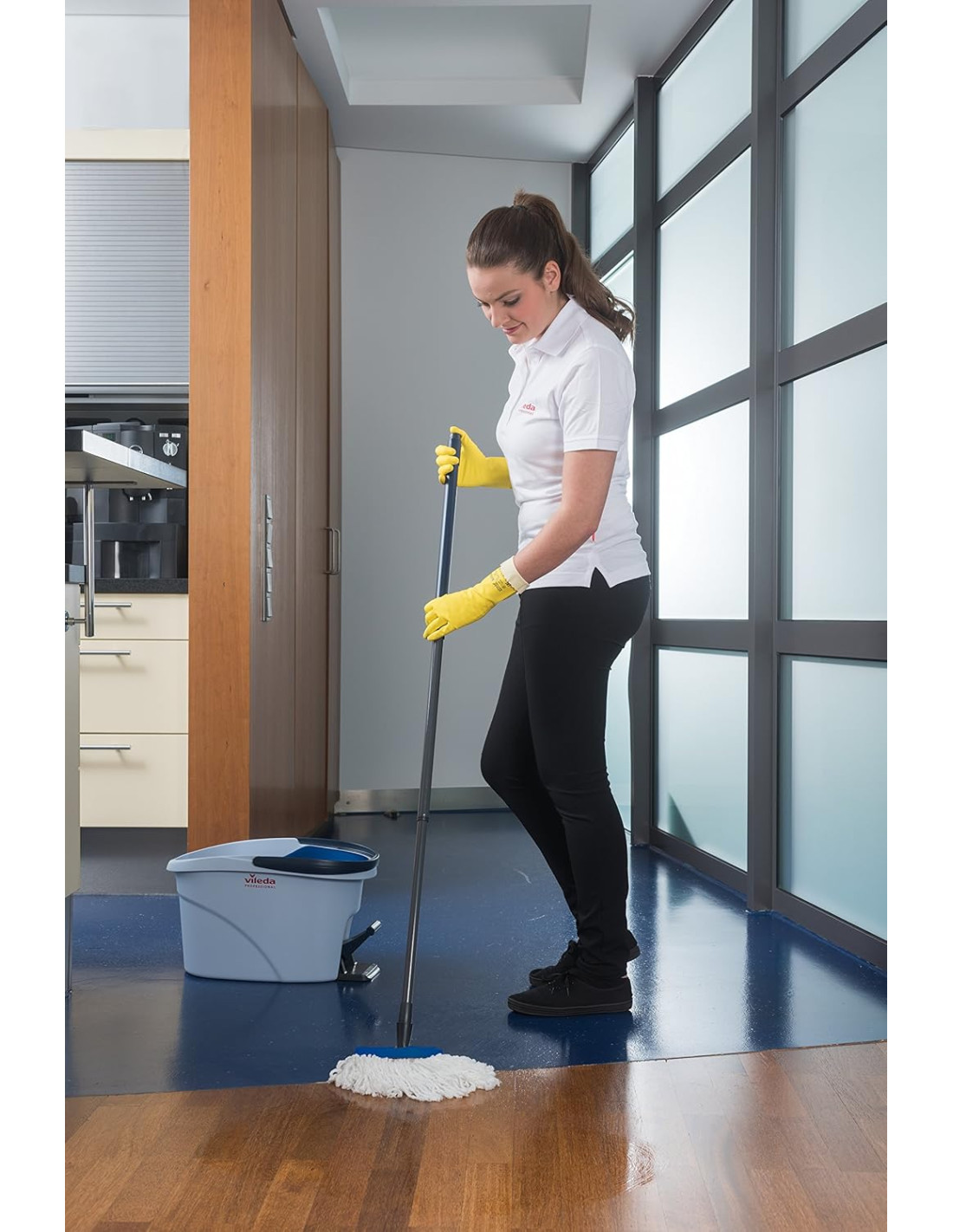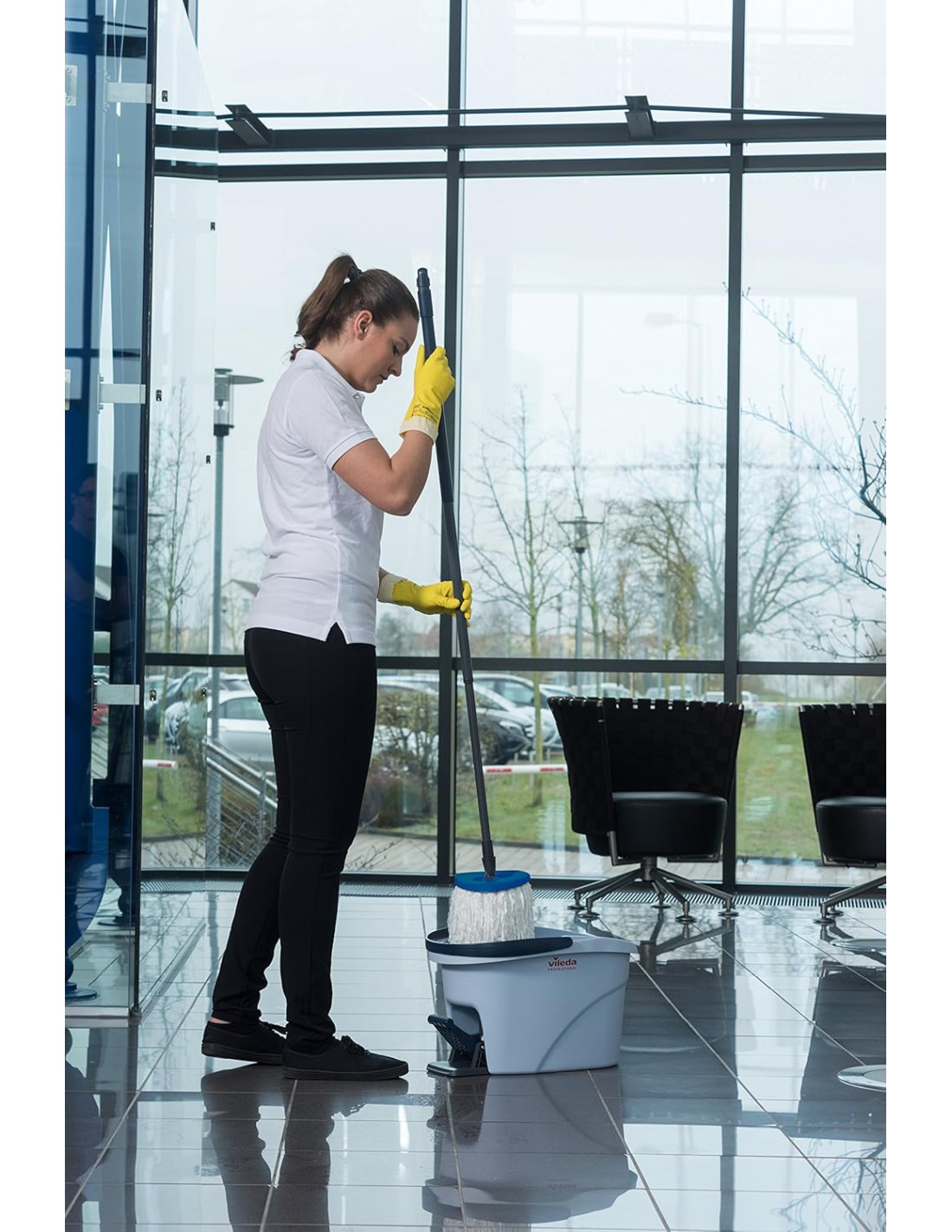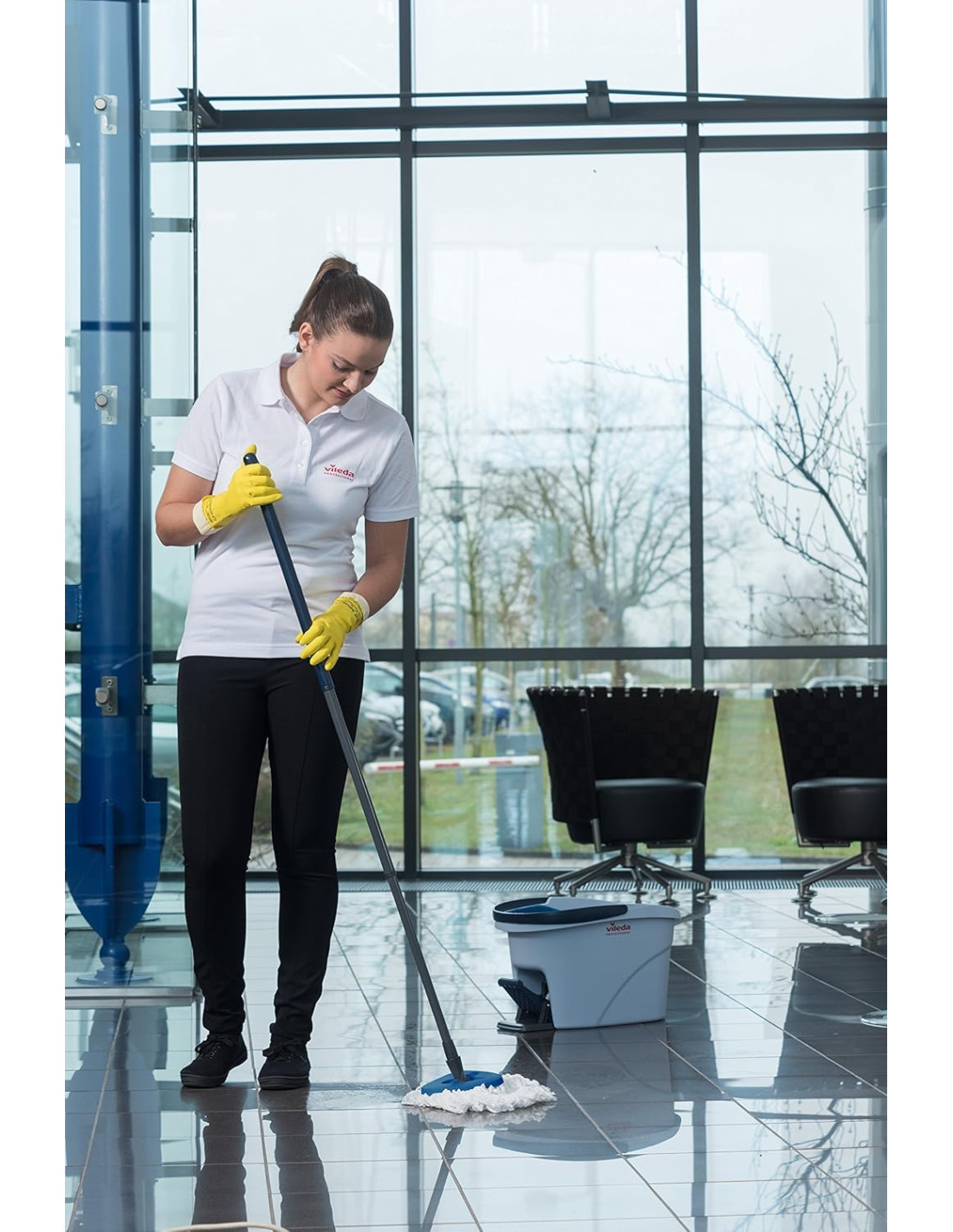 Ultraspin de Vileda es la evolución de la fregona tradicional. Su revolucionario escurridor por centrifugado reduce el esfuerzo y mala postura habitual cuando escurrimos la fregona en un cubo tradicional, con el Ultraspin de Vileda sólo presionando el pedal obtendremos un perfecto centrifugado ( podremos aplicar más o menos centrifugado al gusto). La mopa 100% de microfibras proporciona una limpieza superior a cualquier fregona tradicional, su forma triangular limpia con facilidad las esquinas, el trenzado y bordado de los cabos evitan que suelte pelos en el camino. Es válido para todo tipo de suelos o paredes. 12 litros de capacidad. COMPATIBLE CON CUALQUIER PALO DEL MERCADO DE ROSCA UNIVERSAL.
