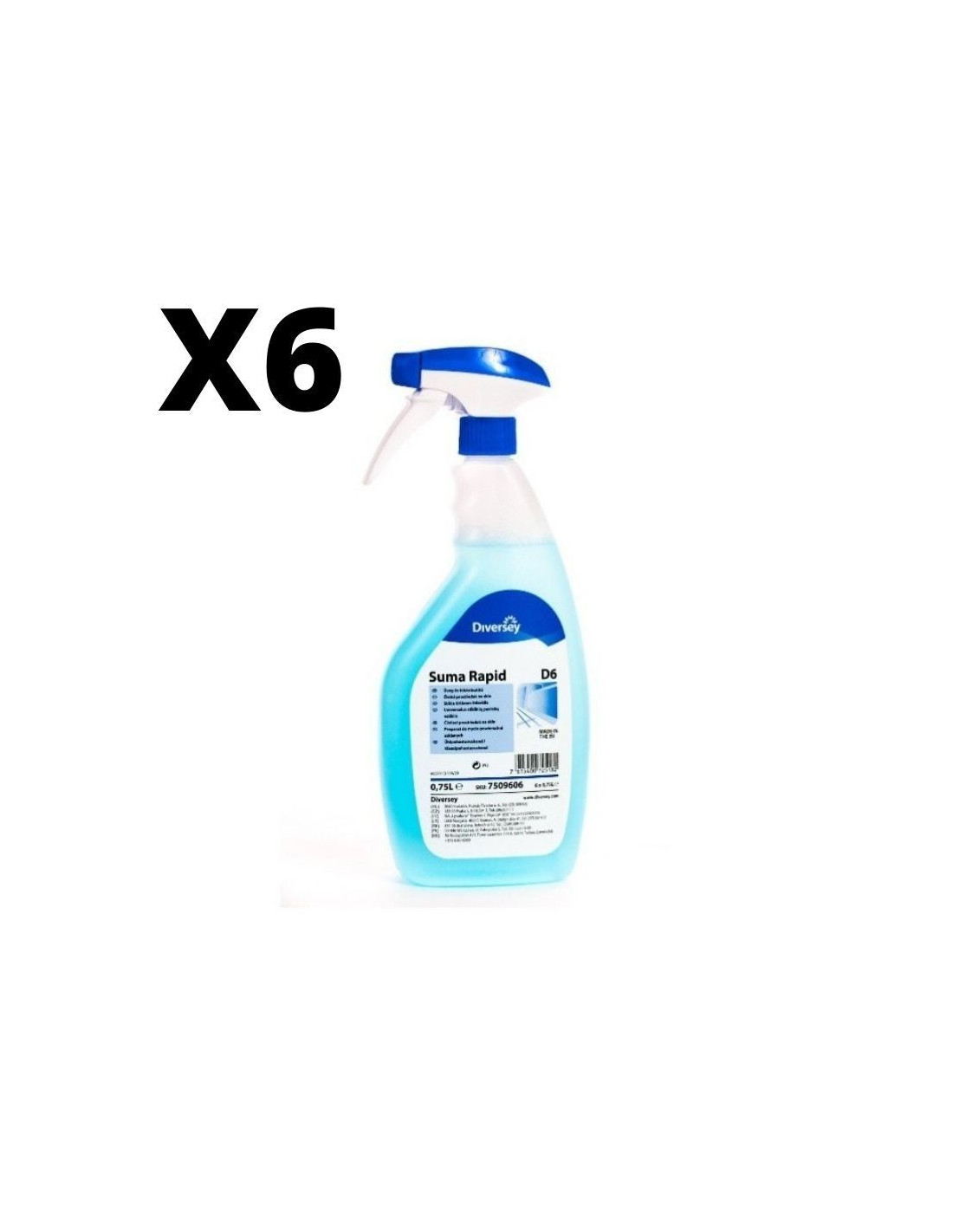 El limpiador de cristales y multiusos Suma Rapid D6 en formato de 6 unidades de 750ml es un limpiador listo para usar para la limpieza de cristales sin dejar velos así como cualquier otra superficie dura resistente al agua. PH neutro y secado rápido. Deja un agradable perfume.