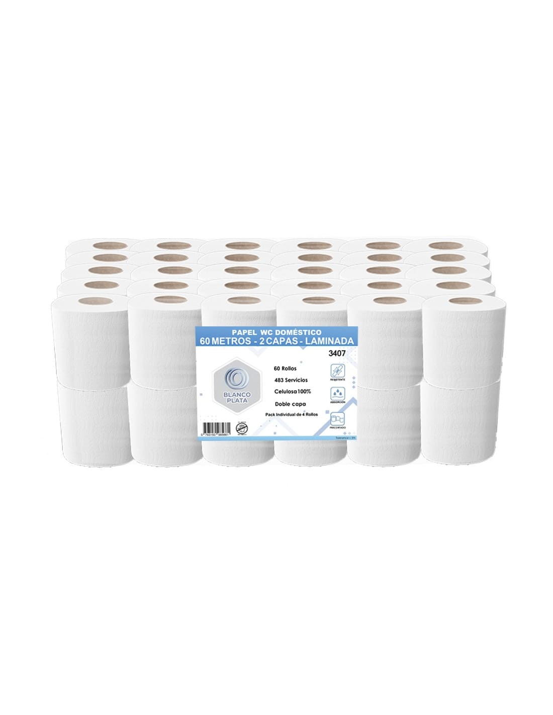 PAPEL WC DOMÉSTICO 60 2 CAPAS GOFRADO PASTA PURA BLANCOPLATA 56 ROLLOS DE 483 SERVICIOS