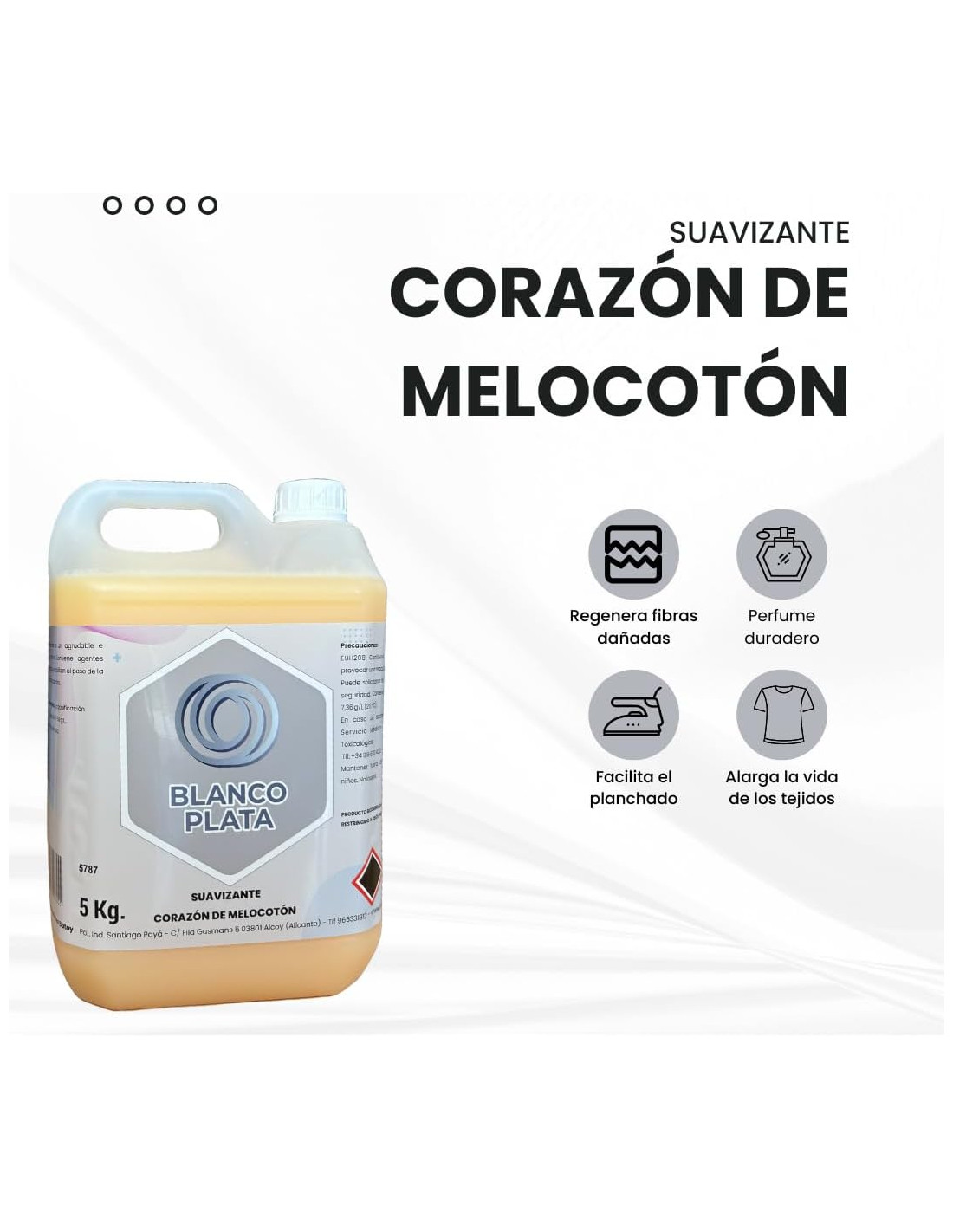 El suavizante corazón de Melocotón Blancoplata de 5l gracias a sus ingredientes es capaz de convertir los tejidos más rígidos y ásperos en tejidos suaves y agradables al tacto, además de perfumarlas con un suave y agradable aroma a melocotón. Alarga la vida de los tejidos y elimina la electricidad estática facilitando el posterior planchado. Con cada garrafa de 5l tienes para aproximadamente 100 lavados.